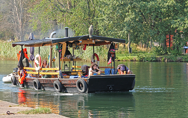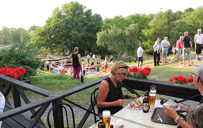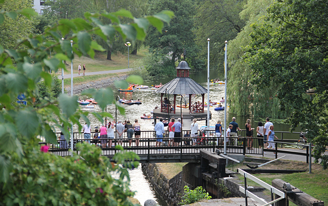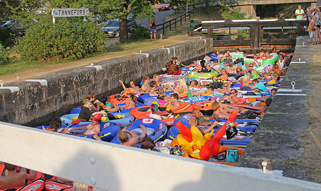 På Café Tannefors slussar avnjöt vi en räkmacka och en Mariestad med utsikt över slussarna och det spektakel som pågick där. Ett stort antal ungdomar hade mött upp för att genomföra en slussning med gummiflottar. Det vart en färggrann tavla med alla inne i slussen samtidigt.
