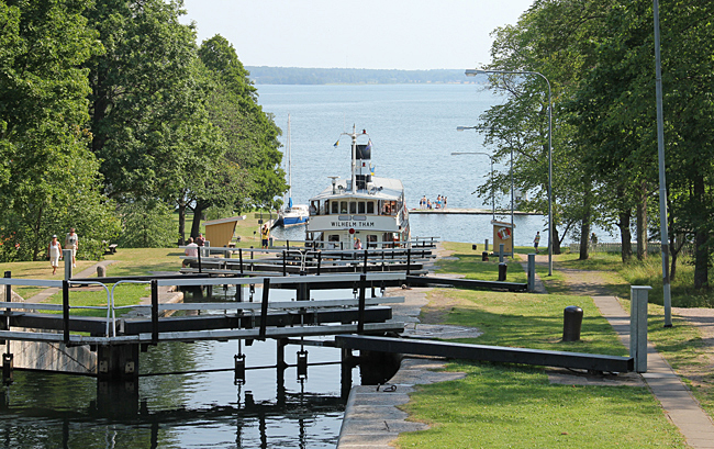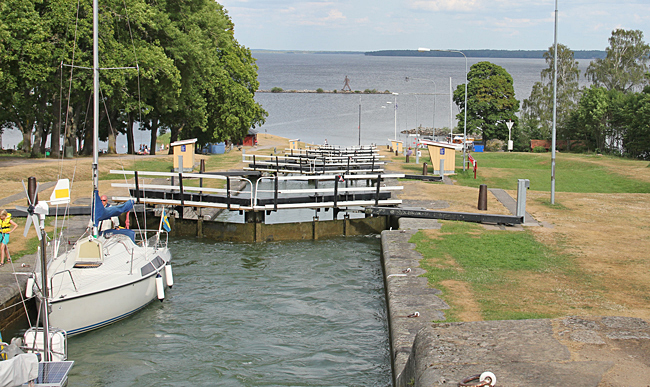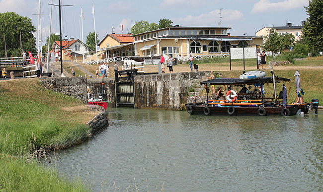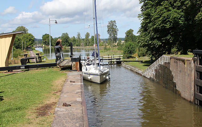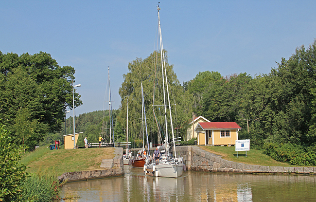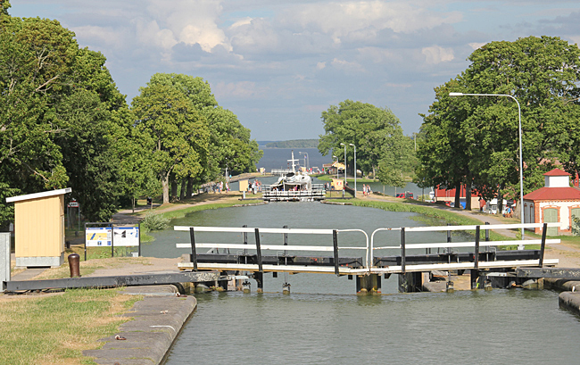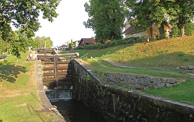 Ställplatsen i Mem är belägen direkt vid inloppet från Östersjön. Där finns även den första slusstrappan. Många båtfarare som skall slussa för första gången är märkbart nervösa vid denna första slussen.