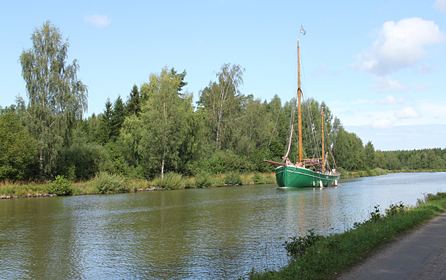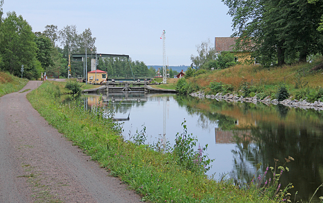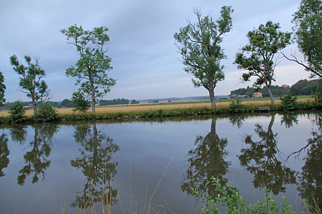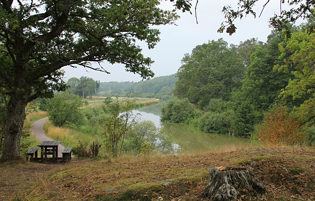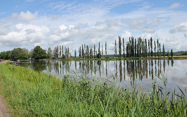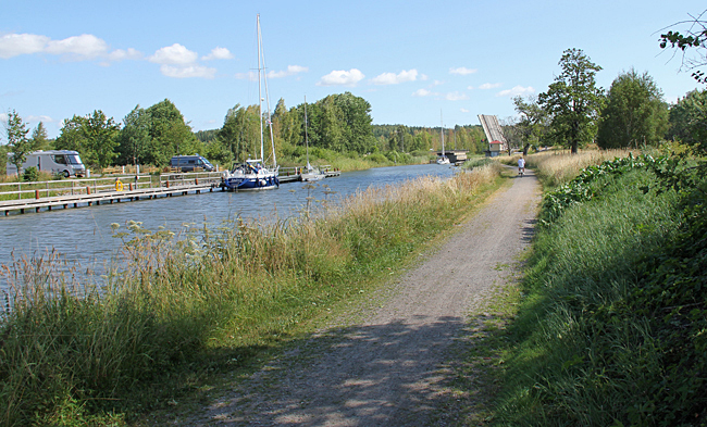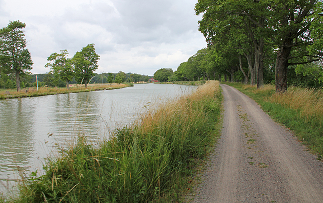 Nästa etapp sker följande dag och då i riktning mot Norsholm fram till sjön Asplången. En sträcka på 11 km. Fortfarande varmt men regnet hänger i luften. På de flesta kanalsträckorna finns de gamla hästdragarvägarna kvar och de passar bra till cykelväg. På den tiden när kanalen byggdes var det ju segelskutor som färdades vattenvägen och de behövde hjälp att ta sig fram på den smala kanalen av oxar som fick agera draglok. Bygget av kanalen startade 1810 och den pampiga invigningen skedde 1832. Mer om historien hittar du här.