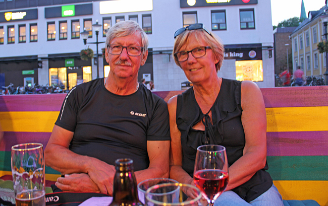 Efter två nätter i Söderköping var det tid att flytta husbilarna till Berg. Först ett stopp i Norsholm för att cykla sträckan från Norsholm till Hulta där kanalen åter tar vid efter sjön Asplången. Vi parkerade utanför Britta och Lennarts nära kött. Gick in och handlade en del charkvaror, kan rekommenderas. Vi tyckte det var skoj att det var våra namn på skylten, så det kändes rätt att låta sig fotograferas.