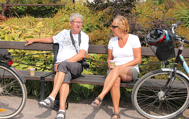 Denna dag den 5 augusti bjuder på regn vilket gör att vi får avvakta med cykelturen tills det hunnit bli kväll. Men då avtar regnet och vi trampar iväg den 17 kilometer långa vägen till Tåtorp och tillbaka, totalt 34 kilometer.